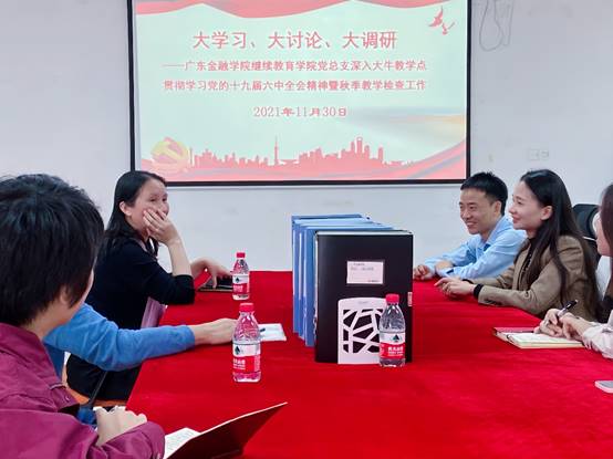11月30日上午,beat365官方网站党总支书记刘薇、学籍管理部主任詹鑫等一行,到广州大牛教学点深入开展党的十九届六中全会精神学习暨秋季教学检查工作,教学点负责人唐流煌、支部书记林耿及各业务主管陪同。