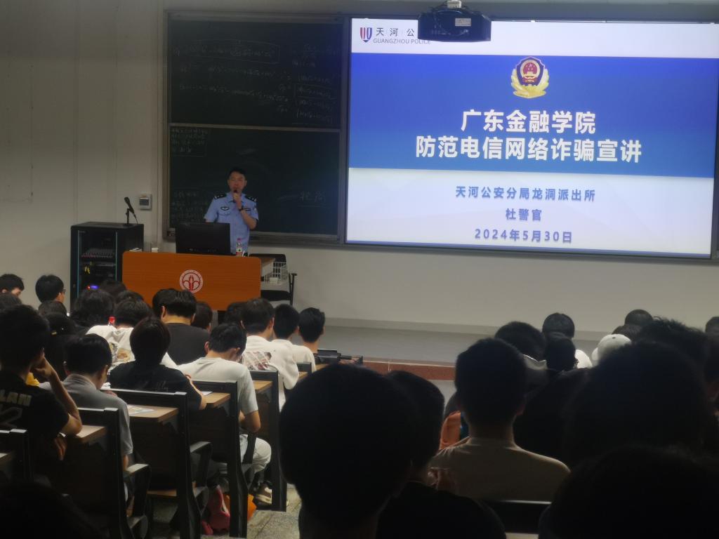 随着网络技术的飞速发展,诈骗手段层出不穷,校园安全面临着前所未有的挑战,为增强学生防范意识,提高学生自我保护能力。5月30日晚,beat365官方网站联合天河公安分局龙洞派出所,在6栋教学楼401举办了“防范电信网络诈骗”宣讲会。
